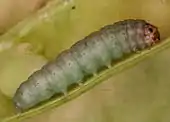 Son envergure est d'environ 22–26 mm et ses chenilles se nourrissent de haricot mungo, Phaseolus lunatus, et d'autres espèces de Fabaceae.