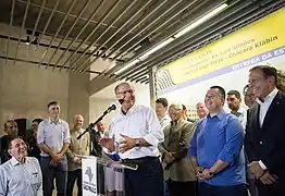Par la suite, en raison de l'avancement des travaux, le gouverneur Geraldo Alckmin a promis la livraison de la station pour décembre 2017, en même temps que la station Moema[4]. Cependant, en novembre 2017, le secrétaire des transports métropolitains, Clodoaldo Pelissioni, a déclaré que les gares seraient livrées "dans les mois à venir"[5]. Au moment où les travaux de la ligne 5 ont été interrompus, seuls 30% des travaux de génie civil de la station Eucalyptus étaient terminés[6],[7]. Pelissoni a promis que d'ici la fin du mois de février 2018, il inaugurerait la station[8]. En février, il était prévu que le 3 mars la station serait inaugurée[9].