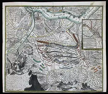 Le prince Eugène réussit à prendre la forteresse de Timişoara dans le Banat à la mi-octobre 1716, mettant ainsi fin à 164 années de gouvernance ottomane sur la région, avant de se concentrer sur la campagne de l'année suivante et sur ce qu'il considère comme le principal objectif de la guerre : la ville de Belgrade[70]. Située à la confluence du Danube et de la Save, Belgrade abrite une garnison de 30 000 hommes commandés par Mustapha Pacha. Les forces impériales mettent le siège devant la ville à la mi-juin 1717 ; à la fin juillet, de grands pans de la ville ont été détruits par l'artillerie. Les premiers jours d'août, une immense armée ottomane dirigée par Hacı Halil Pacha (en), forte de 150 000 à 200 000 hommes, arrive sur le plateau à l'Est de la ville pour délivrer la garnison[71]. La nouvelle de la destruction imminente de l'armée impériale fait le tour de l'Europe, mais le prince Eugène n'a absolument pas l'intention de lever le siège[72]. Ses hommes souffrent de dysenterie et sont soumis à un bombardement continu depuis le plateau ; le prince, sachant que seule une victoire décisive peut sortir son armée de cette situation délicate, décide d'assaillir les troupes de renfort. Le matin du 16 août, 40 000 soldats de l'armée impériale marchent à travers le brouillard, attaquent les Ottomans par surprise et mettent l'armée de Halil Pacha en déroute. Une semaine plus tard, Belgrade se rend, mettant effectivement un terme à la guerre. Cette victoire est le couronnement de la carrière militaire du prince Eugène.