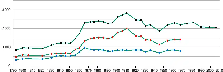 Depuis 1911 et jusqu'après la Seconde Guerre mondiale, la décroissance est régulière.