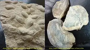 On peut trouver des fossiles dans les différentes couches. Les calcaires du jurassique présentent de nombreux coquillages bivalves (photo de gauche). On trouve dans les marnes crétacées de nombreux Ostrea ou Gryphea, ancêtres des huîtres (photo de droite).