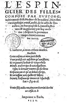 - Eustorg de Beaulieu, L'Espinglier des filles, composé par Eustorg, aultrement dict Hector de Beaulieu : Reveu et augmenté par luy mesme, depuis sa première impression, comme on verra, Basle, s.n., , 8 ff. non ch. ; in-8