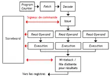 Celui est basé sur 4 grandes étapes : l'issue, la lecture des opérandes, l’exécution, et l'écriture des résultats. Ces 4 étages de pipeline sont parfois présents dans d'autres processeurs qui ne gèrent pas l'exécution dans le désordre. Mais ceux-ci ne fonctionnent pas de la même façon dans l'algorithme de scoreboarding.
