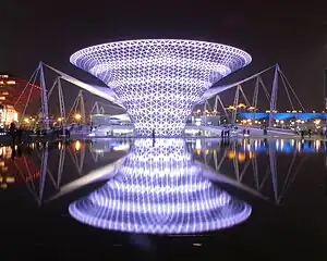 La combinaison de la structure de la membrane, qui a une surface de 65 000 m2 au total avec une portée de 100 m, et les six entonnoirs, faits d'acier et de verre, de 45 m de hauteur, formés d'un cadre double courbe de forme libre, constitue l'emblème de l'Expo de Shanghai 2010[1].