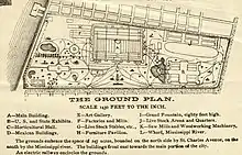 Le site avait ceci de remarquable qu'il pouvait être accessible directement par chemin de fer (une gare fut construite), bateau à vapeur ou navire océanique (des embarcadères fluviaux et maritimes furent prévus). Le bâtiment principal couvrait 13 hectares et était la plus grande structure couverte à cette époque, illuminé par 5 000 lumières électriques, système relativement nouveau, quand la ville, elle, n'en comptait que quelques centaines. Le site comprenait également une vaste salle horticole (Horticultural Hall), une tour d'observation desservie par un ascenseur alimenté par l'électricité, sans compter les pavillons représentant tous les pays et les industriels invités. Le parc était sillonné d'une ligne de tramway également alimentée par l'électricité. Le pavillon mexicain était le plus somptueux, il fut aussi le plus populaire : il coûta plus de 200 000 dollars et mettait en vedette une énorme fanfare qui attira les foules[2],[3],[4]. Le pavillon français était représenté par son délégué, Henri Farjas, qui était parvenu à mobiliser quelques industriels, et eut un certain succès auprès de la communauté francophone locale[5].