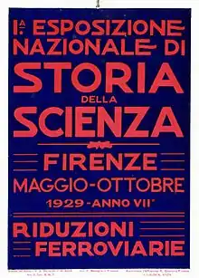 La première Exposition nationale d’histoire de la science[1] présentait au public des éléments scientifiques considérés comme ayant une valeur historique, et s’est déroulée au Palazzo delle Esposizioni de Florence de mai à novembre 1929.