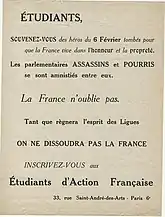 Le 16 mars 1934, une grande réunion des Étudiants d'Action française se tient à la salle Bullier à Paris et rassemble près de 8 000 personnes[24].