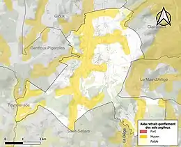 Le retrait-gonflement des sols argileux est susceptible d'engendrer des dommages importants aux bâtiments en cas d’alternance de périodes de sécheresse et de pluie. 36,7 % de la superficie communale est en aléa moyen ou fort (33,6 % au niveau départemental et 48,5 % au niveau national). Sur les 91 bâtiments dénombrés sur la commune en 2019, 8 sont en aléa moyen ou fort, soit 9 %, à comparer aux 25 % au niveau départemental et 54 % au niveau national. Une cartographie de l'exposition du territoire national au retrait gonflement des sols argileux est disponible sur le site du BRGM[16],[Carte 2].