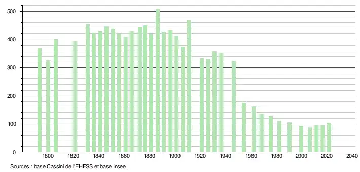 L'évolution du nombre d'habitants est connue à travers les recensements de la population effectués dans la commune depuis 1793. Pour les communes de moins de 10 000 habitants, une enquête de recensement portant sur toute la population est réalisée tous les cinq ans, les populations légales des années intermédiaires étant quant à elles estimées par interpolation ou extrapolation[28]. Pour la commune, le premier recensement exhaustif entrant dans le cadre du nouveau dispositif a été réalisé en 2006[29].