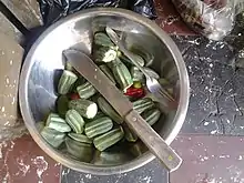 Pour préparer le févi, il faut au préalable laver et découper les gombos de telle sorte qu'ils soient soit en petits dés soit très fins. Ensuite, il faut, dans une petite quantité d'eau, émincer les gombos avec de la potasse puis laisser mijoter à feu doux.