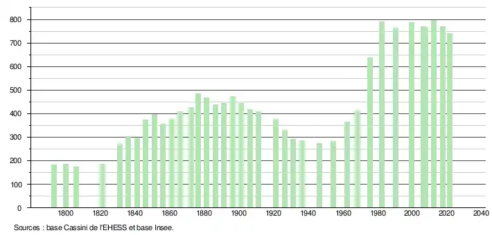 L'évolution du nombre d'habitants est connue à travers les recensements de la population effectués dans la commune depuis 1793. Pour les communes de moins de 10 000 habitants, une enquête de recensement portant sur toute la population est réalisée tous les cinq ans, les populations légales des années intermédiaires étant quant à elles estimées par interpolation ou extrapolation[16]. Pour la commune, le premier recensement exhaustif entrant dans le cadre du nouveau dispositif a été réalisé en 2007[17].