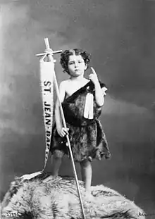 En France, Jean-Baptiste était depuis longtemps considéré comme le protecteur des bergers; nombre de ces bergers étant des enfants, il était courant d’évoquer le saint sous les traits d’un enfant couvert d’une peau de mouton[45]. En 1866, un certain Alfred Chalifoux, tailleur à Montréal, inspiré par des peintures religieuses vues dans des églises, a l’idée d’intégrer à la procession un jeune garçon représentant le petit Jean-Baptiste accompagné d’un agneau[46]. La mise en scène imaginée par Chalifoux étant déjà connue et comprise de tous, elle est rapidement adoptée et devient la norme pour près d’un siècle[47].