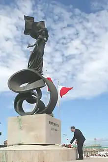 Mémorial il-Ħelsien à Vittoriosa. - Jum l-Indipendenza, le jour de l'Indépendance, . De concession en suspension, de suppression en rétablissement d'une constitution permettant une démocratisation et une administration plus directe par les Maltais eux-mêmes, la reine du Royaume-Uni accordait à l'archipel maltais l'indépendance au sein du Commonwealth. À l'extrémité des jardins Maglio à Floriana, face à la fontaine des Tritons et à la porte d'entrée dans La Valette, est inauguré le , pour le 25e anniversaire de l'indépendance, un monument surmonté d'une statue symbolisant l'Indépendance[12]. C'est le lieu d'une manifestation en souvenir de ce moment tous les 21 de septembre.