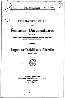 La Fédération belge des femmes universitaires fut créée en 1921 et constituée sous forme d’A.S.B.L. en 1922[37]. La FBFU, dont le siège était situé à Bruxelles[37], fut à l’origine essentiellement composée de femmes universitaires issues de l’ULB. Cette composition laissa d’ailleurs parfois penser que la FBFU était plutôt d’opinion laïque[38] même si la Fédération s’est toujours revendiquée comme étant dépourvue d’appartenance idéologique et politique[37].