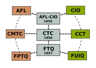 En 1954, l'AFL et le CIO concluent un pacte de non-maraudage; les pendant canadiens des deux organisations, le Congrès des métiers et du travail du Canada (CMTC) et Congrès canadien du travail (CCT) concluent une entente similaire l'année suivante. La fusion de l'AFL et de la CIO est réalisée en  ; la fusion du CMTC et du CCT survient en . En , le 19e congrès de la Fédération provinciale du travail (FPTQ) dans la ville de Québec ratifie à l'unanimité la constitution et l'accord de fusion avec la FUIQ pour la formation de la nouvelle FTQ. La FUIQ adopte l'accord de fusion et la nouvelle constitution à son congrès les et .