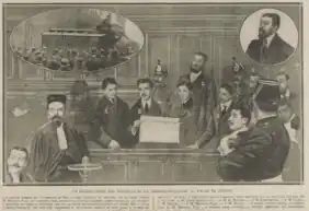 Le premier procès fait à un Camelot du Roi a lieu le 24 décembre : Serge Real del Sarte, élève à l'école des Beaux-Arts, est accusé de « violence à agent »[14]. Le même jour, un groupe de cinq cents manifestants, conduit par son frère Maxime et les Camelots, se dirige vers le Sénat et envahit la cour du palais aux cris de « À bas la République ». Pour se faire connaître, les Camelots du Roi n'hésitent pas à se faire arrêter volontairement pour comparaître en procès public et pour faire parler d'eux dans la presse.