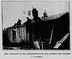 Les Camelots du roi reconstruisent les maisons des inondés à Vigneux dans l'Almanach de l'Action française de 1911.