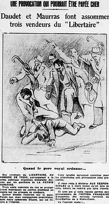 Le soir du 31 mai 1923, le catholique Marc Sangnier, le radical Maurice Viollette et le socialiste Marius Moutet doivent s’exprimer lors d’un meeting salle des sociétés savantes contre le « fascisme français »[44]. Mais les Camelots du Roi agressent les trois hommes en les battant et enduisant de goudron et d'encre d'imprimerie. Les victimes échappent de justesse à un traitement à l'huile de ricin[45]. Le lendemain, les communistes, les socialistes et, pour la première fois, les radicaux expriment leur profond mécontentement. Les radicaux, par la voix de leur chef Édouard Herriot, demandent au gouvernement de réaffirmer son caractère républicain.[réf. souhaitée] À cause de cette agression, les Camelots du Roi furent surnommés les « apaches du Roy » dans plusieurs titres de presse[46],[47],[48].
