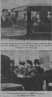 Le 13 février 1936, lors des obsèques de l'historien royaliste Jacques Bainville, Léon Blum fend le cortège en voiture, boulevard Saint-Germain, à Paris. Reconnaissant le député socialiste, un groupe de Camelots du roi, emmené par le cagoulard Jean Filiol, le blesse[67]. En dépit de la brutalité de l'agression, les médecins de l'hôtel-Dieu constatent « une oreille entamée et une artériole rompue »[68]. Le président du Conseil et ministre de l'Intérieur, Albert Sarraut, décrète dans les heures qui suivent la dissolution « des associations et groupements de fait, dénommés ci-après : la Ligue d'Action française, la Fédération nationale des Camelots du roi et la Fédération nationale des étudiants d'Action française » sur le fondement de la loi du 10 janvier 1936.