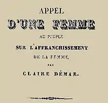 Éteintes sous l’Empire et la Restauration, les revendications féministes renaissent en France avec la révolution de 1830. Un féminisme militant se développe à nouveau dans les milieux socialistes de la génération romantique, en particulier chez les saint-simoniens et les fouriéristes de la capitale. Les féministes participent à l'abondante littérature de l'époque, favorisée par la levée de la censure sur la presse. La Femme Libre et La Tribune des femmes paraissent en 1832 ; Le Conseiller des femmes[28], édité à Lyon par Eugénie Niboyet, est le premier journal féministe de province.
