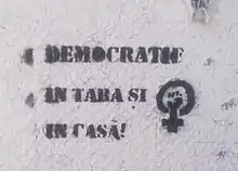 Graffiti féministe anonyme « Démocratie dans le pays et à la maison » à Bucarest (2013).