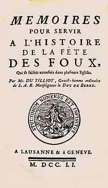 La fête des Fous, ou fête des Innocents, était une mascarade, organisée en principe les 26, 27 et , à laquelle les ecclésiastiques participaient activement. Organisée par le clergé en Europe et attestée dans beaucoup de villes du Nord de la France dès le XIIe siècle, cette pratique s'est étendue du clergé dans la rue, favorisant la création de troupes d'écoliers dans les collèges et de basochiens dans les milieux juridiques, et perdure jusqu'au XVIIe siècle. Dérivées des Saturnales romaines, ces fêtes paillardes sont reliées aux traditions populaires rurales par les folkloristes à la fin du XIXe siècle, et les historiens voient dans ces parodies liturgiques une des origines médiévales du théâtre[2].