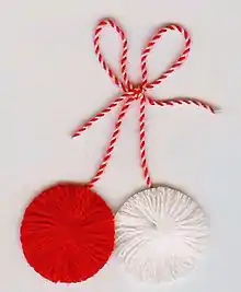 Quoi qu’il en soit, les martenitsi/mărțișoare sont aujourd’hui des talismans que l’on épingle à la poitrine, portés pendant huit jours, formés d’un fil rouge et d’un fil blanc tressés ensemble, auquel on peut attacher des objets décoratifs : des fleurs ou des animaux en bois, en céramique, en verre ou en métal[5],[6].
