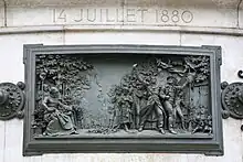 Fête nationale du 14 juillet 1880, haut-relief en bronze de Léopold Morice, Monument à la République, place de la République, Paris, 1883.Cette journée-là, vous ne lui reprocherez pas d’avoir versé une goutte de sang, d’avoir jeté la division à un degré quelconque dans le pays, Elle a été la consécration de l’unité de la France. Oui, elle a consacré ce que l’ancienne royauté avait préparé. L’ancienne royauté avait fait pour ainsi dire le corps de la France, et nous ne l’avons pas oublié ; la Révolution, ce jour-là, le 14 juillet 1790, a fait, je ne veux pas dire l’âme de la France – personne que Dieu n’a fait l’âme de la France – mais la Révolution a donné à la France conscience d’elle-même (« très-bien ! » sur les mêmes bancs) ; elle a révélé à elle-même l’âme de la France. »