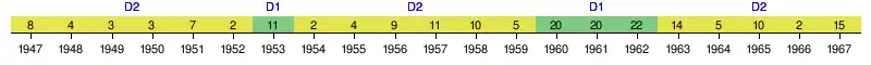 | 1947 | 2e Centre | 8e | 28 | 28 | 13 | 2 | 13 | 54 | 47 | +7 | Huitièmes de finale Q |