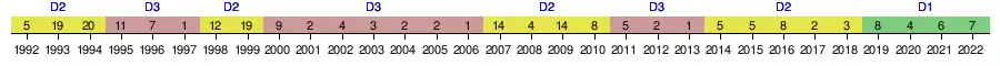 | 2015-2016 | 8e | 40 | 30 | 11 | 7 | 12 | 30 | 29 | +1 | Seizièmes de finale | |