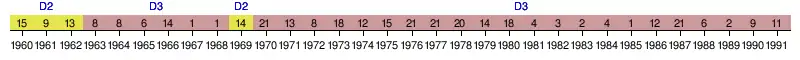 | 1974 | 3e Zone 2 | 12e | 37 | 38 | 15 | 7 | 16 | 47 | 48 | -1 | |
