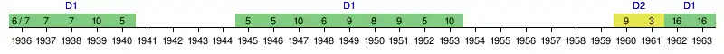 | 1939 | 10e | 22 | 26 | 8 | 6 | 12 | 41 | 56 | -15 | Seizièmes de finale | |