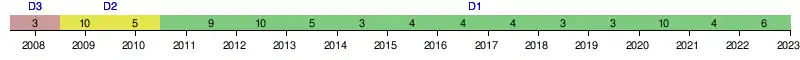 | 2010 | 5e | 61 | 38 | 17 | 10 | 11 | 60 | 44 | +26 | Seizièmes de finale | |||