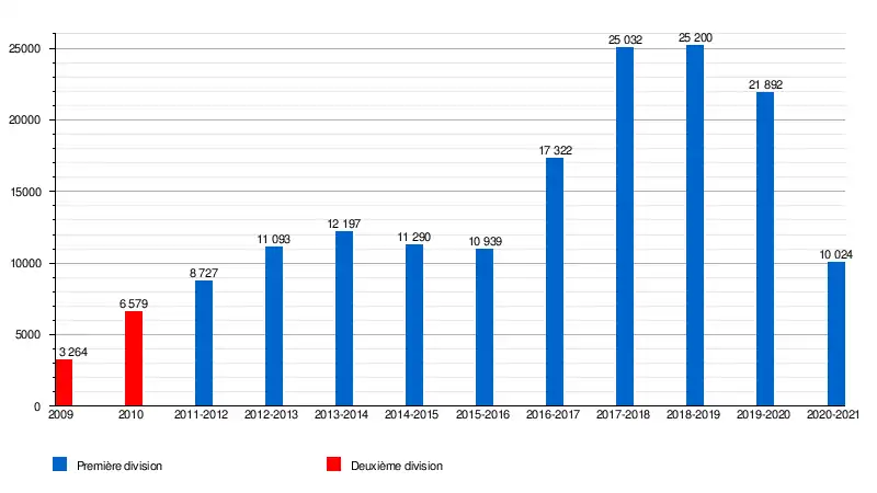 Le graphique suivant représente le nombre moyen de spectateurs à domicile du FK Krasnodar en championnat par match par saison depuis 2009[45].
