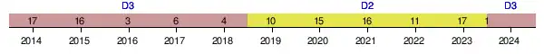 | 2019-2020 | 15e | 28 | 27 | 6 | 10 | 11 | 32 | 34 | -2 | 11 | |||