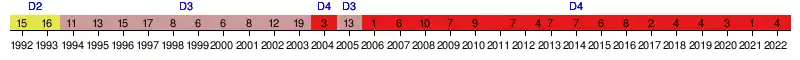 | 2001 | 8e | 45 | 30 | 14 | 3 | 13 | 45 | 43 | +2 | Deuxième tour | |