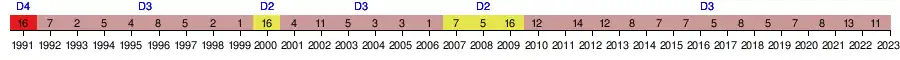 | 2013-2014 | 8e | 29 | 27 | 6 | 11 | 10 | 30 | 32 | -2 | 256es de finale | |
