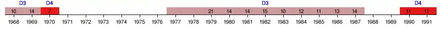 | 1969 | 14e | 32 | 40 | 11 | 10 | 19 | 32 | 42 | -10 | ||