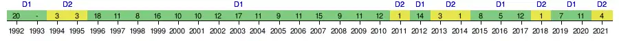 | 1996 | 1re | 18e | 10 | 34 | 2 | 4 | 28 | 12 | 77 | -65 | |