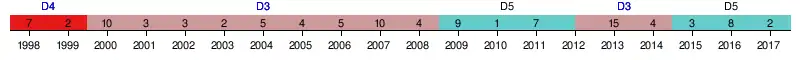 | 2005 | 4e | 45 | 24 | 13 | 6 | 5 | 54 | 27 | +27 | Seizièmes de finale | |