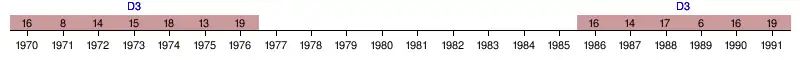 | 1990 | 3e Ouest | 16e | 37 | 42 | 12 | 13 | 17 | 34 | 45 | -11 | |