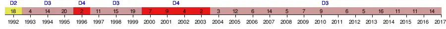 | 1998 | 3e Ouest | 15e | 45 | 40 | 12 | 9 | 19 | 34 | 41 | -7 | Premier tour |