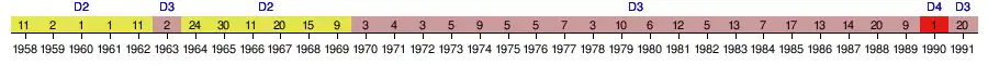 | 1965 | 30e | 35 | 46 | 12 | 11 | 23 | 33 | 57 | -24 | — | |