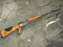 - Version A : arme du tireur d’élite avec lunette APX 806 L modifiée, une ligne de mire de nuit rabattable, un bipied rabattable à branches télescopiques et un poids de détente de 2 à 2,5 kg.