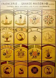HB : « HB » sont les lettres De la Hubaudière, distinguant cette manufacture de celle de Henriot (« HR »). Rien dans les actes n'indique de façon formelle que HB signifie Hubaudière Bousquet, ce peut être aussi tout simplement HuBaudière. Cette faïencerie fut fondée par Pierre Bousquet. Par alliance, elle passa à Pierre Clément Caussy. En 1776, Antoine de la Hubaudière, gendre de Caussy, prenait les rênes de la fabrique. Au début des années 1920, HB lance la production de grès de haut de gamme, aux formes et décors Art déco, sous la marque Odetta.