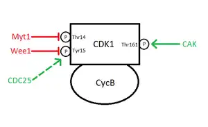 Au cours de la phase G1, la composante CDK1 du MPF est inactive en raison de l'enzyme inhibitrice Wee1, ce qui rend le MPF inactif. Au cours de la transition de la phase G2 à la phase M, CDK1 est déphosphorylé par CDC25. La composante CDK1 est maintenant libre et peut se lier à la cycline B, activer MPF et faire entrer la cellule dans la phase de mitose.