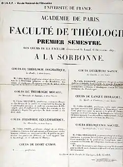 La faculté de théologie de Paris est une des quatre facultés de l'ancienne Université de Paris. Fermée en 1793, elle renaît en 1808 comme faculté de théologie catholique de Paris au sein de l'Académie de Paris de l'Université de France. En 1877, fut créée également une faculté de théologie protestante à la suite de la perte de l'Alsace-Lorraine et de la faculté de théologie de Strasbourg. Elle est supprimée en 1885 et remplacée par une nouvelle section de l'École pratique des hautes études. Elle siégeait à la Sorbonne et c'est l'École nationale des chartes qui hérita de ses locaux. Une nouvelle faculté de théologie, appelée Theologicum, est créée en 1889 par le pape Léon XIII au sein de l'Université catholique de Paris pour remplacer la faculté de théologie catholique publique. Cette dernière faculté conserve jusqu'à aujourd'hui les traditions de la faculté de théologie de l'ancienne Sorbonne, fondée au XIIe siècle.