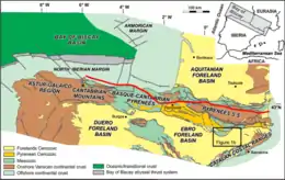 Au centre et à l'est des Pyrénées, la faille nord-pyrénéenne délimite la zone nord-pyrénéenne au nord de la zone axiale au sud. Il est plus difficile de repérer la faille à l'ouest, car elle disparaît localement de la surface pour réapparaître à plus au sud-ouest vers les montagnes basques. À l'ouest, au pays basque espagnol, elle marque par un décrochement continu côté au sud de la nappe des marbres et de l'arc plissé basque. Dans la province de Santander, la faille longe le littoral atlantique. La limite méridionale de la zone axiale se trouve alors entièrement en Espagne.