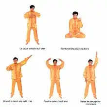Le premier exercice, appelé « Bouddha étend ses mille bras », est destiné à faciliter la libre circulation de l'énergie dans le corps et à ouvrir les méridiens. Le second exercice, « Position debout du Falun », consiste en quatre postures statiques, chacune similaire à la tenue d’une roue invisible, pendant une période de temps prolongée. L'objectif de cet exercice est d’augmenter le niveau d’énergie. Le troisième, « Relier les deux pôles cosmiques », comporte trois séries de mouvements permettant d'expulser la mauvaise énergie du corps (par exemple, l’énergie pathogène ou qi noir) et la remplacer par de la bonne énergie. Grâce à la pratique de cet exercice, le pratiquant est censé nettoyer et purifier son corps. Le quatrième exercice, « Le circuit céleste du Falun », vise à faire circuler l'énergie librement dans tout le corps. Contrairement aux quatre premiers, le cinquième exercice est effectué assis en position du lotus ou du demi-lotus pour les débutants. Appelé « Renforcer les pouvoirs divins », c'est une méditation destinée à être maintenue aussi longtemps que possible et il est considéré par Li Hongzhi comme l'exercice le plus avancé[27].