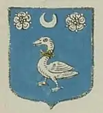 | Blasonnement | D'azur à une oye d'argent, le col passé dans une couronne d'or, ou à un cygne d’argent becqué et membré de sable, et un croissant d'argent posé en chef, accosté de deux roses de même[1],[2]. |